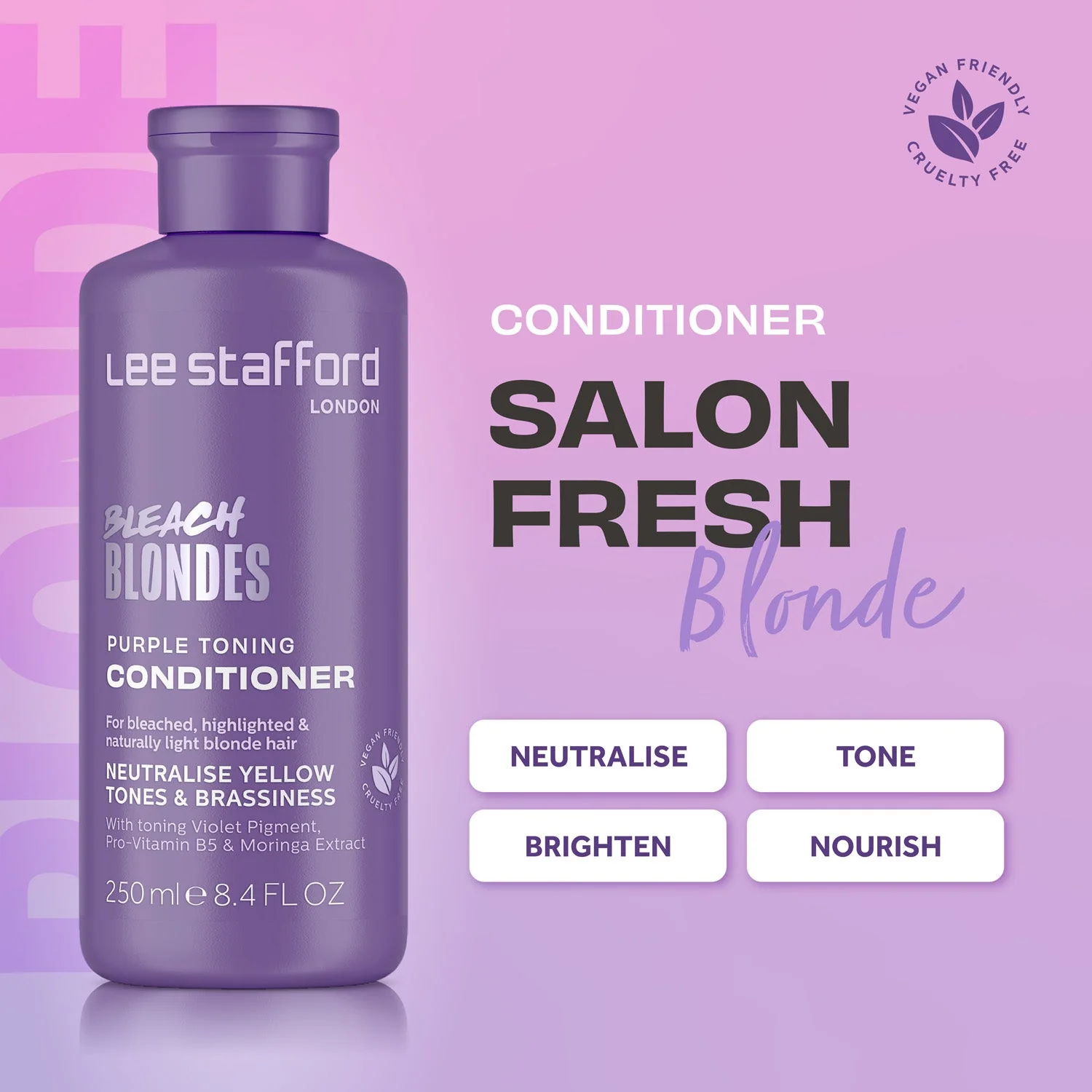 El Purple Toning Conditioner de Lee Stafford es el compañero ideal del shampoo de la misma línea. Su fórmula rica hidrata profundamente el cabello rubio o decolorado mientras prolonga el efecto matizador. Neutraliza los tonos amarillos y deja el cabello suave, brillante y fácil de peinar. Úsalo regularmente para mantener ese rubio frío que tanto te gusta.